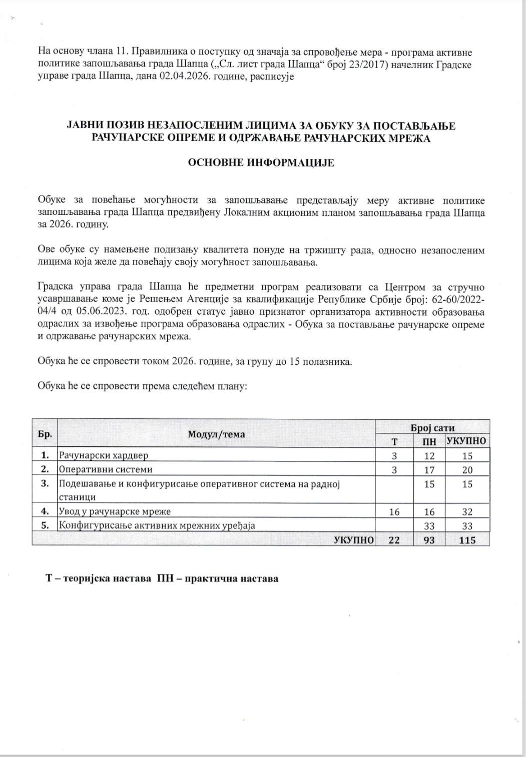 Grad Šabac raspisuje Javni poziv za nezaposlena lica za učešće u programu obuke za postavljanje računarske opreme i održavanje računarskih mreža, u okviru mera aktivne politike zapošljavanja za 2026. godinu.