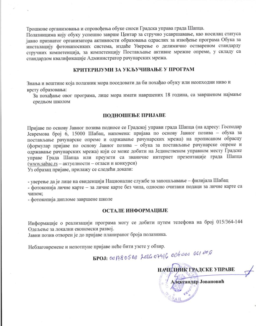 GRAD ŠABAC RASPISUJE JAVNI POZIV ZA BESPLATNU OBUKU
