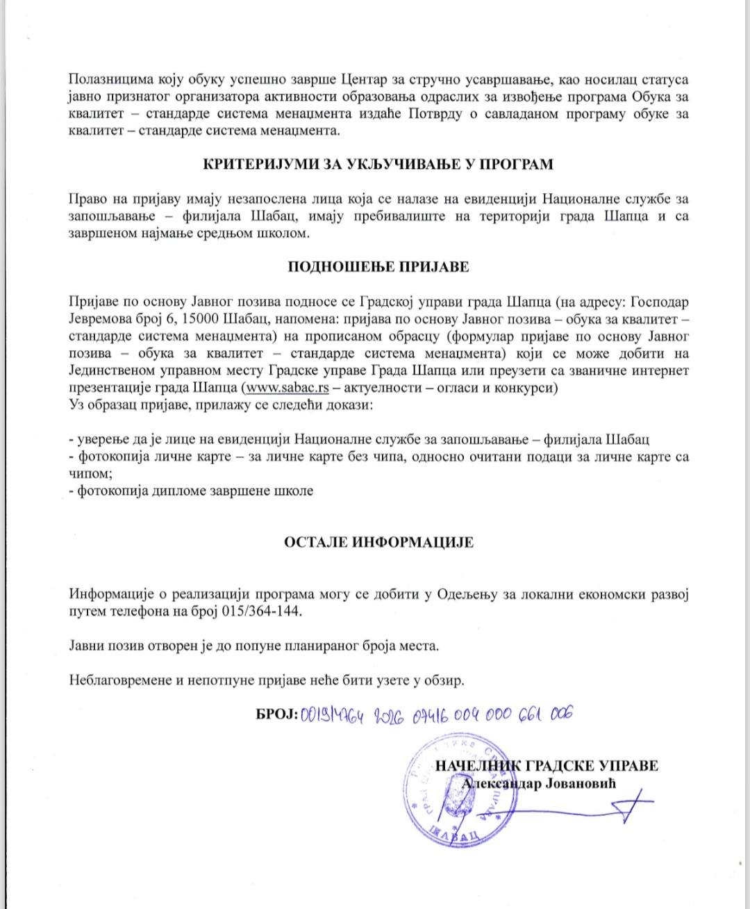 Grad Šabac raspisuje JAVNI POZIV za nezaposlena lica za učešće u obuci „Kvalitet – standardi sistema menadžmenta“