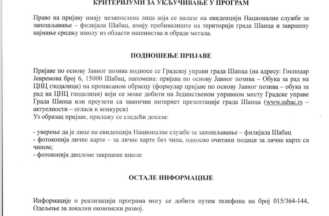 JAVNI POZIV ZA OBUKU – CNC GLODALICE Grad Šabac raspisuje Javni poziv za nezaposlena lica za besplatnu obuku za rad na numerički upravljanim (CNC) glodalicama. Obuka je namenjena svima koji žele da unaprede svoje veštine i povećaju šanse za zaposlenje u oblasti mašinstva i obrade […]