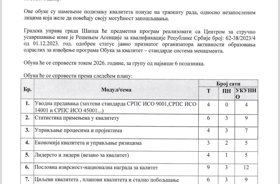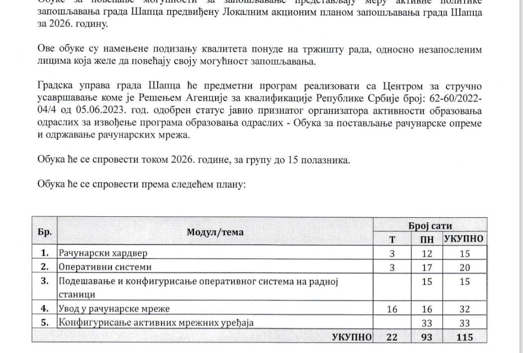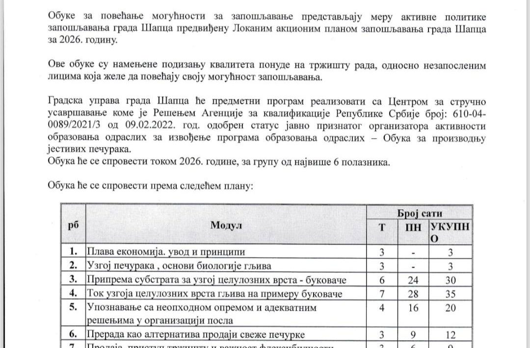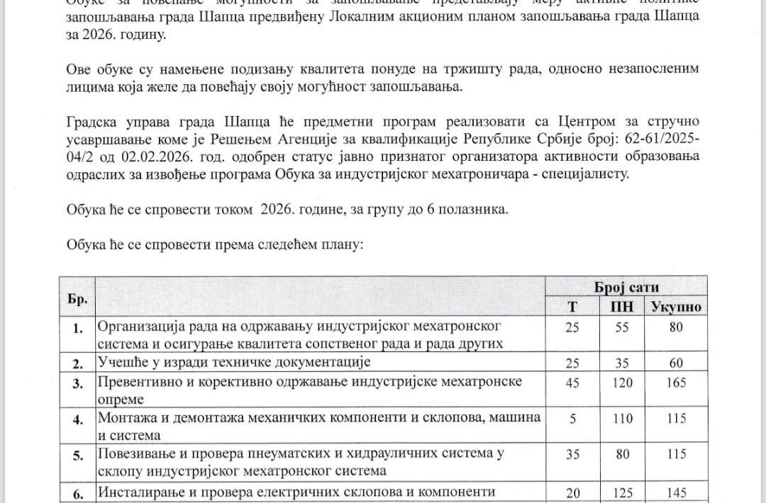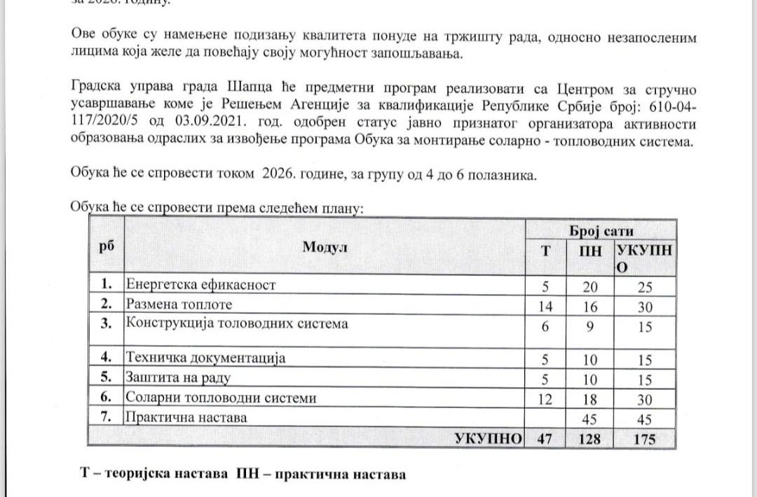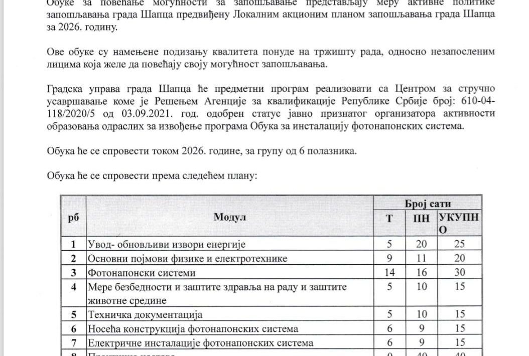 Grad Šabac raspisuje JAVNI POZIV za učešće u besplatnoj obuci za instalaciju fotonaponskih (solarnih) sistema, koja se realizuje u okviru mera aktivne politike zapošljavanja za 2026. godinu. Ova obuka namenjena je nezaposlenim licima koja žele da unaprede svoja znanja i veštine, povećaju konkurentnost na tržištu […]