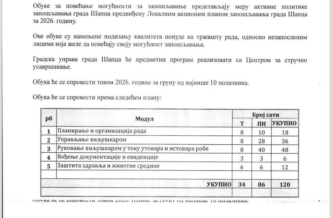 Grad Šabac raspisuje javni poziv za nezaposlena lica za pohađanje obuke za rukovanje viljuškarom, u cilju povećanja zapošljivosti i sticanja novih veština na tržištu rada.Obuka obuhvata: Planiranje i organizaciju rada, upravljanje viljuškarom, rukovanje pri utovaru i istovaru robe,vođenje dokumentacije i evidencije,zaštitu zdravlja i životne sredine.Ukupan […]